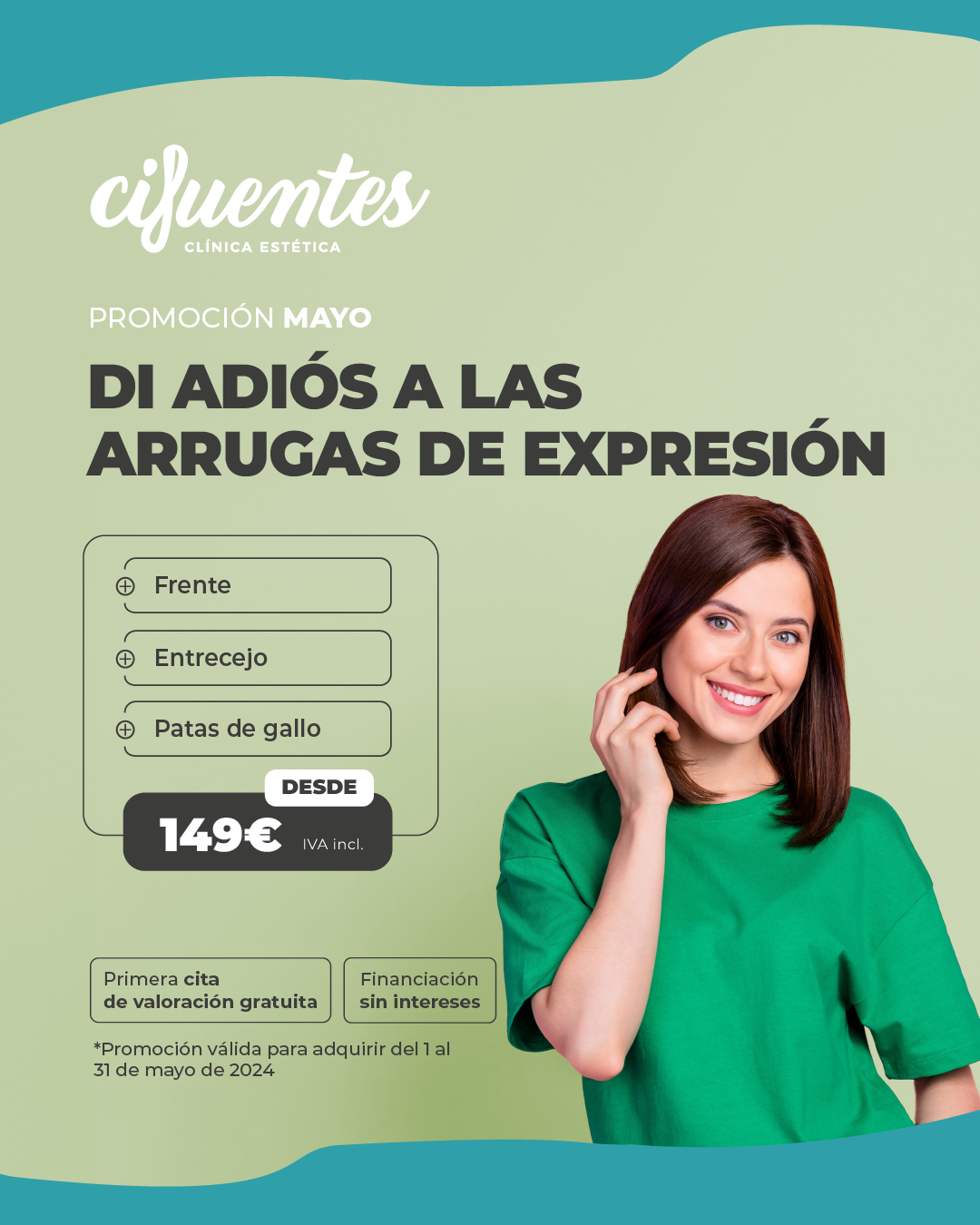 ¿Quieres despedirte de esas molestas líneas en la frente, entrecejo y patas de gallo? ¡Ahora es posible desde solo 149 euros en Clínica Cifuentes! Con nuestra avanzada tecnología y tratamientos de vanguardia, lograrás una piel más suave, joven y radiante. Además, te ofrecemos financiación sin intereses para que puedas acceder a tus tratamientos de forma cómoda y sin preocupaciones. ¡Y eso no es todo! Durante todo el mes de mayo, la primera cita de valoración será completamente GRATIS.